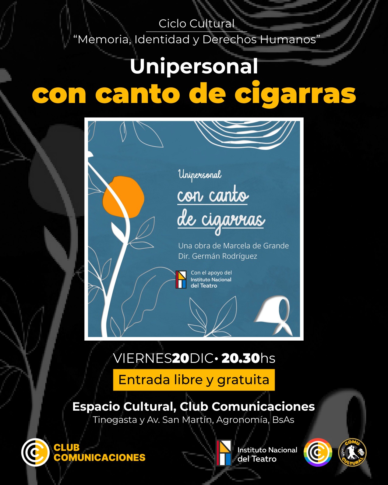 Mañana viernes a las 20.30hs en el *Ciclo Cultural “Memoria, Identidad y Derechos Humanos”* del *Club Comunicaciones*, Tinogasta y Av. San Martín, en el barrio de Agronomía, se presenta *“Unipersonal con canto de cigarras”*.