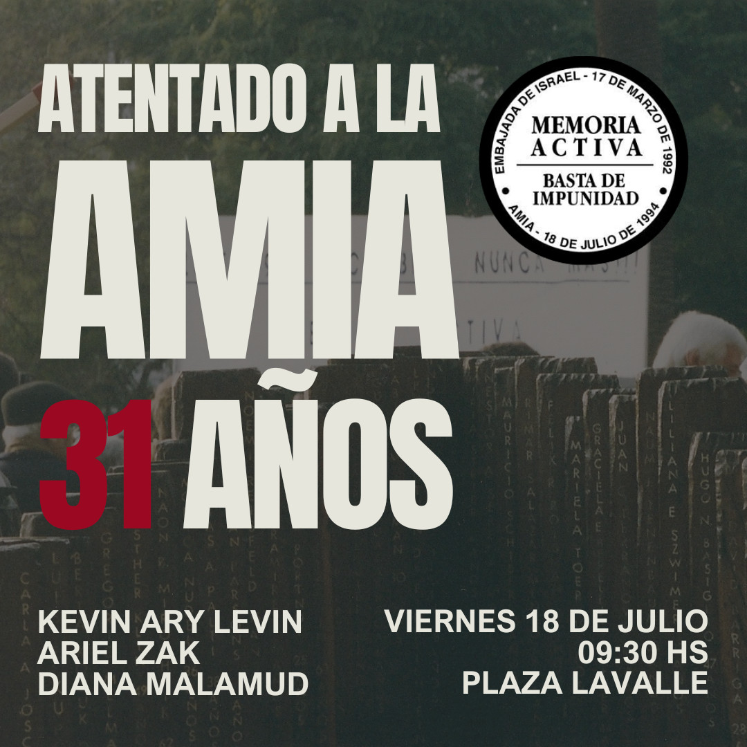 31 AÑOS DE IMPUNIDAD Acto aniversario del atentado a la AMIAEste viernes 18 de julio, realizaremos nuestro acto por el 31 aniversario del atentado a la AMIA. Será a las 09:30 horas en Plaza Lavalle (frente a Tribunales). Oradores: Kevin Ary Levin, analista internacional. Ariel Zak, periodista. Diana Malamud, Memoria Activa.