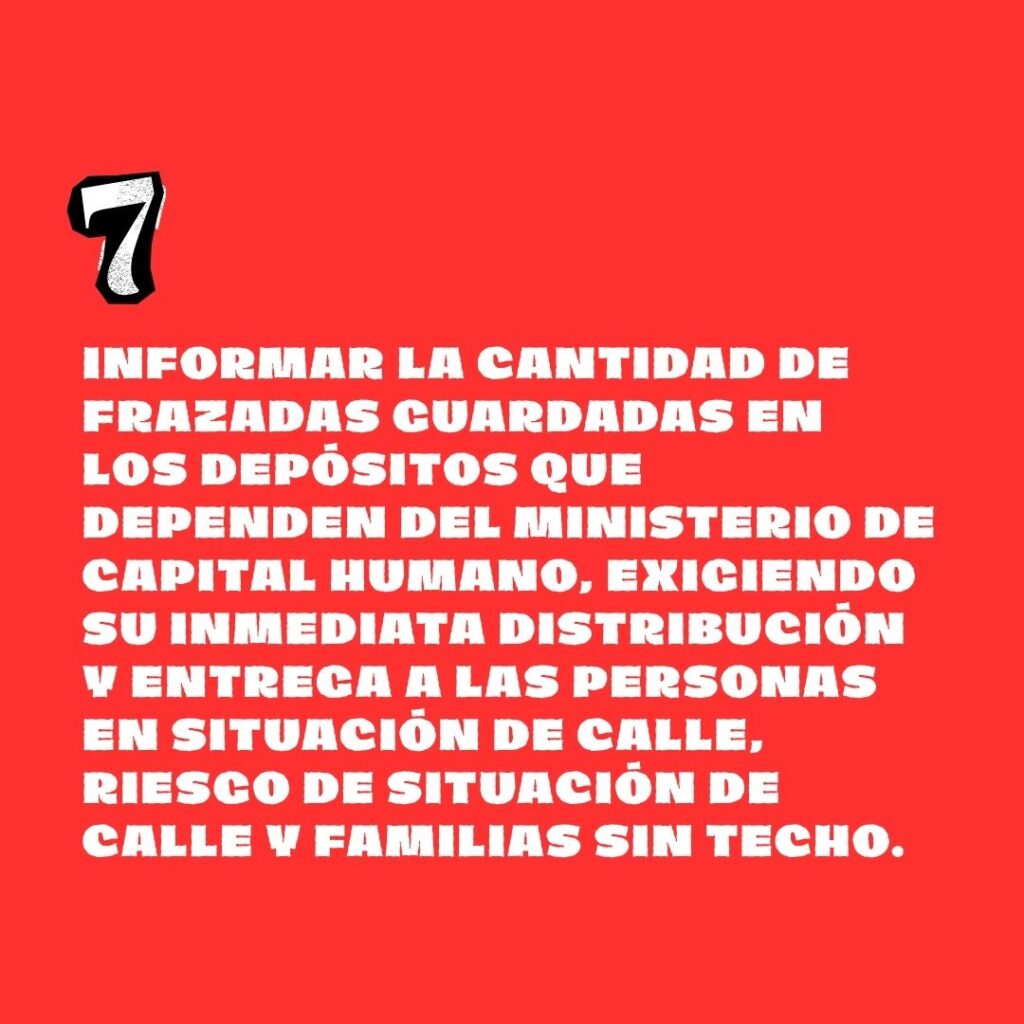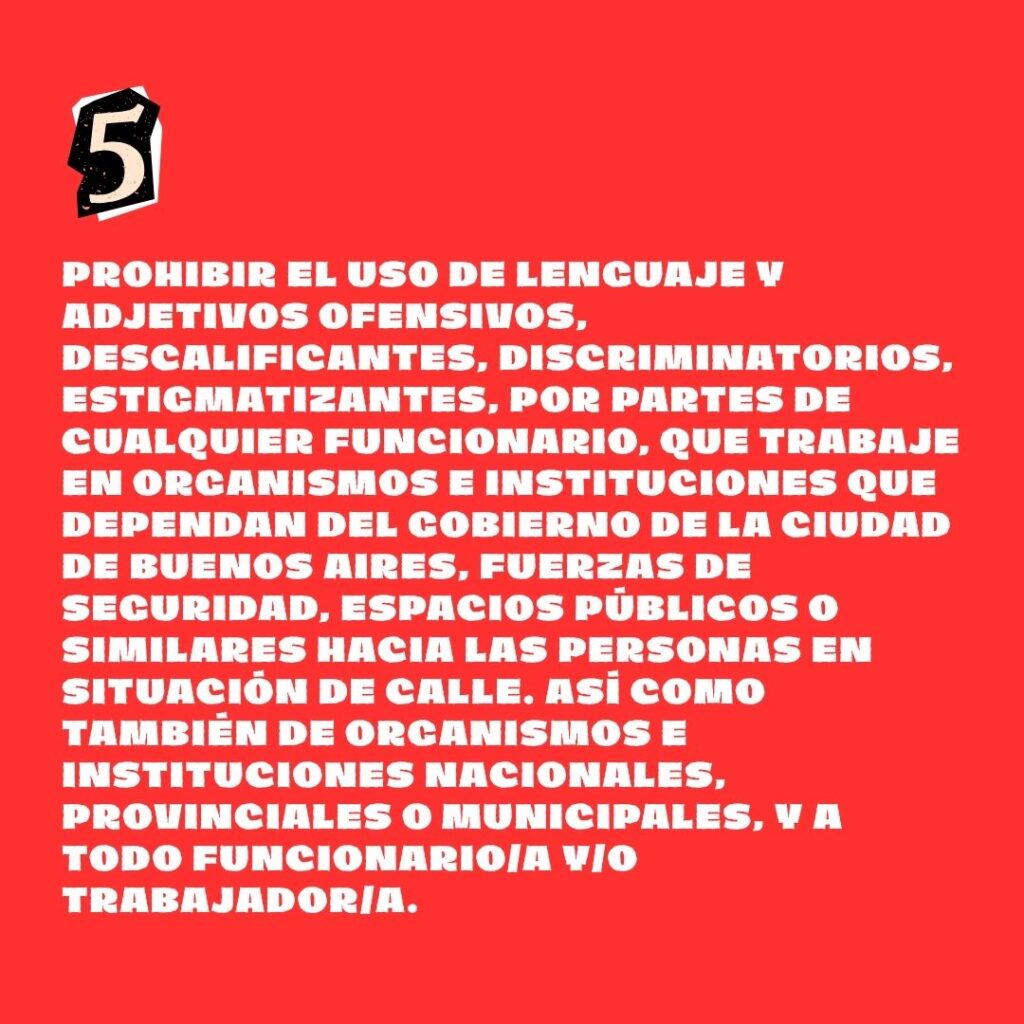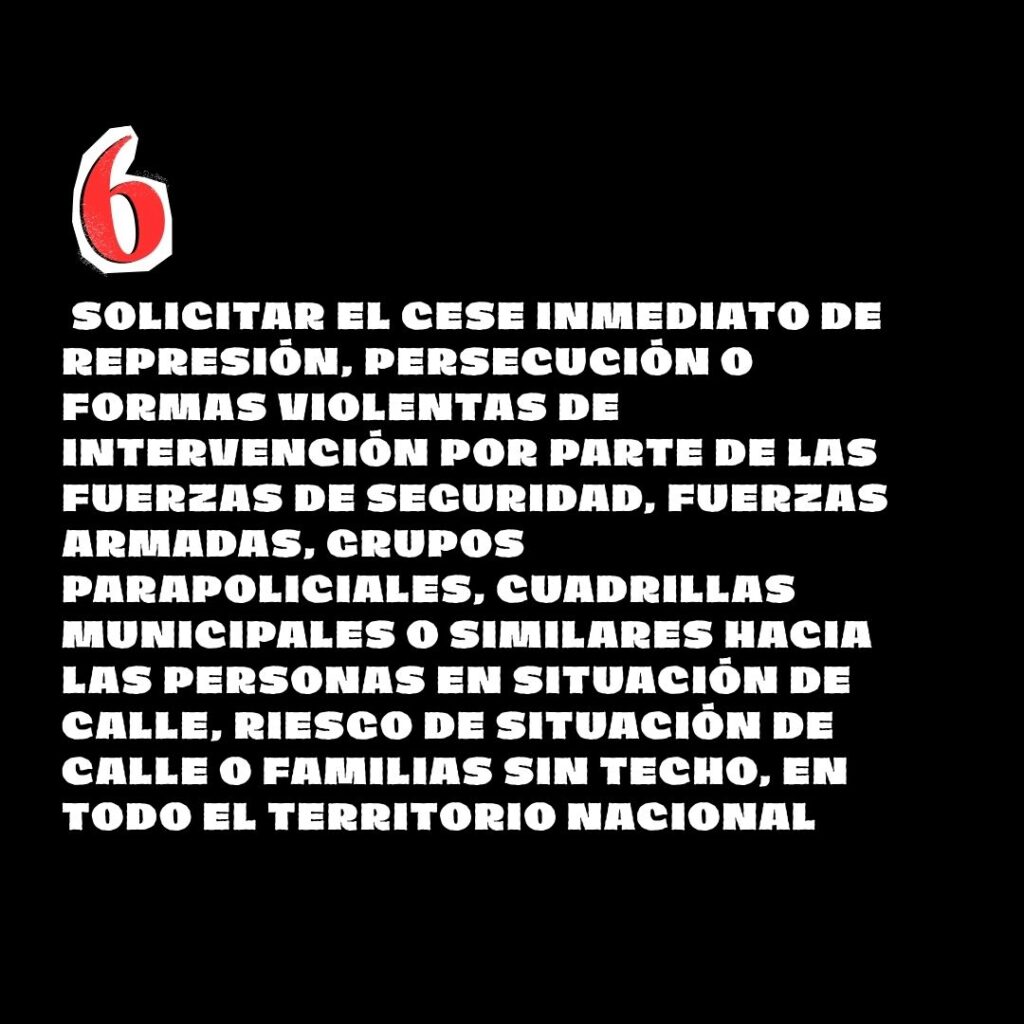 Además presentaron algunos puntos acordados entre las organizaciones participantes del censo. Entre esos puntos se exige el estricto cumplimiento de la ley de CABA, tanto como la nacional. Decretar la emergencia de personas en situación de calle, prohibir el uso de lenguaje con adjetivos ofensivos o deshumanizantes por parte de funcionarios de la Ciudad y solicitar el cese inmediato de represión, entre otros.