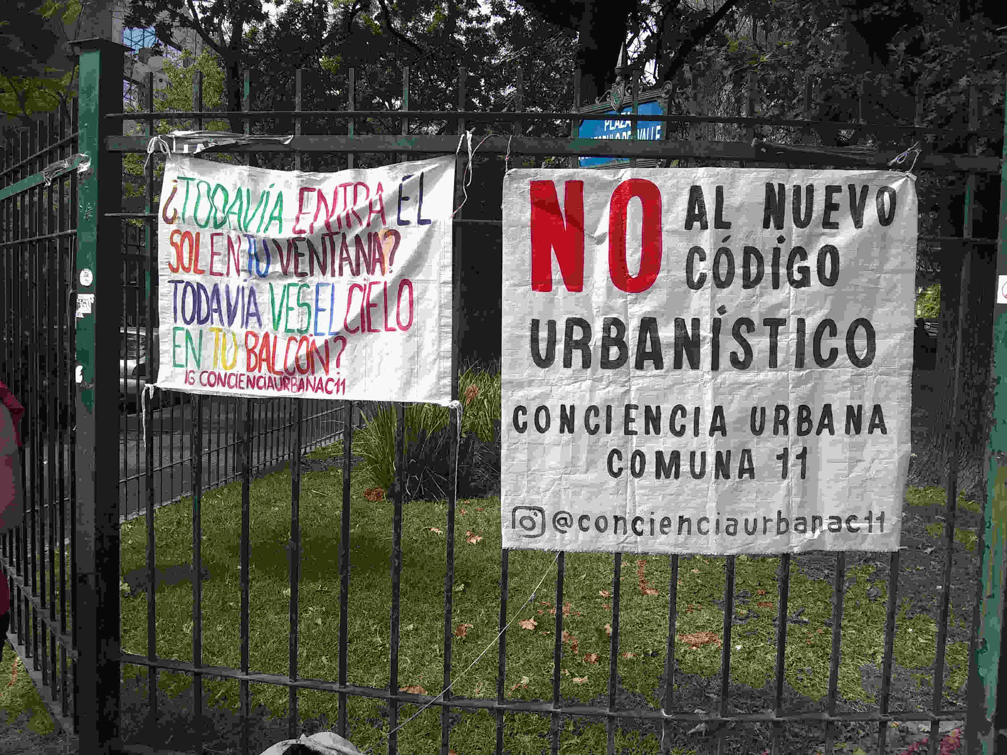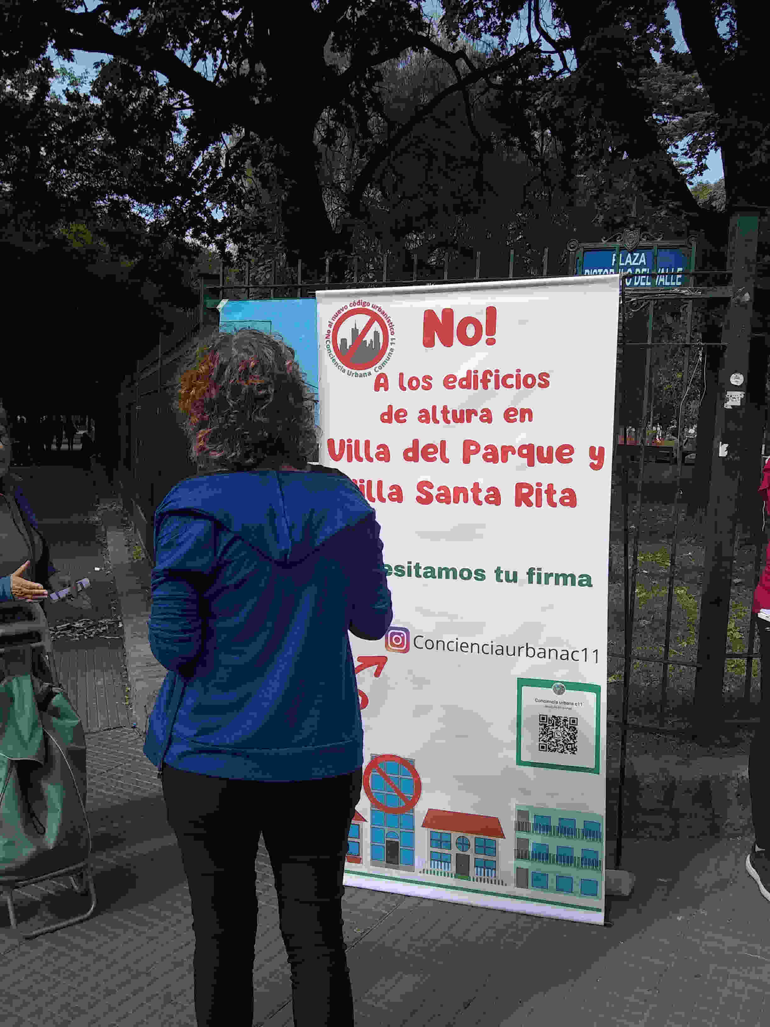 Con el clima a favor, a las 11 de la mañana del sábado ya estaba armada la mesa con las planillas a firmar y los carteles colgados contra las rejas de la plaza Aristóbulo del Valle, en la esquina de Baigorria y Cuenca. Desde allí interpelaban “¿Todavía entra el sol en tu ventana? ¿Todavía ves el cielo en tu balcón?”