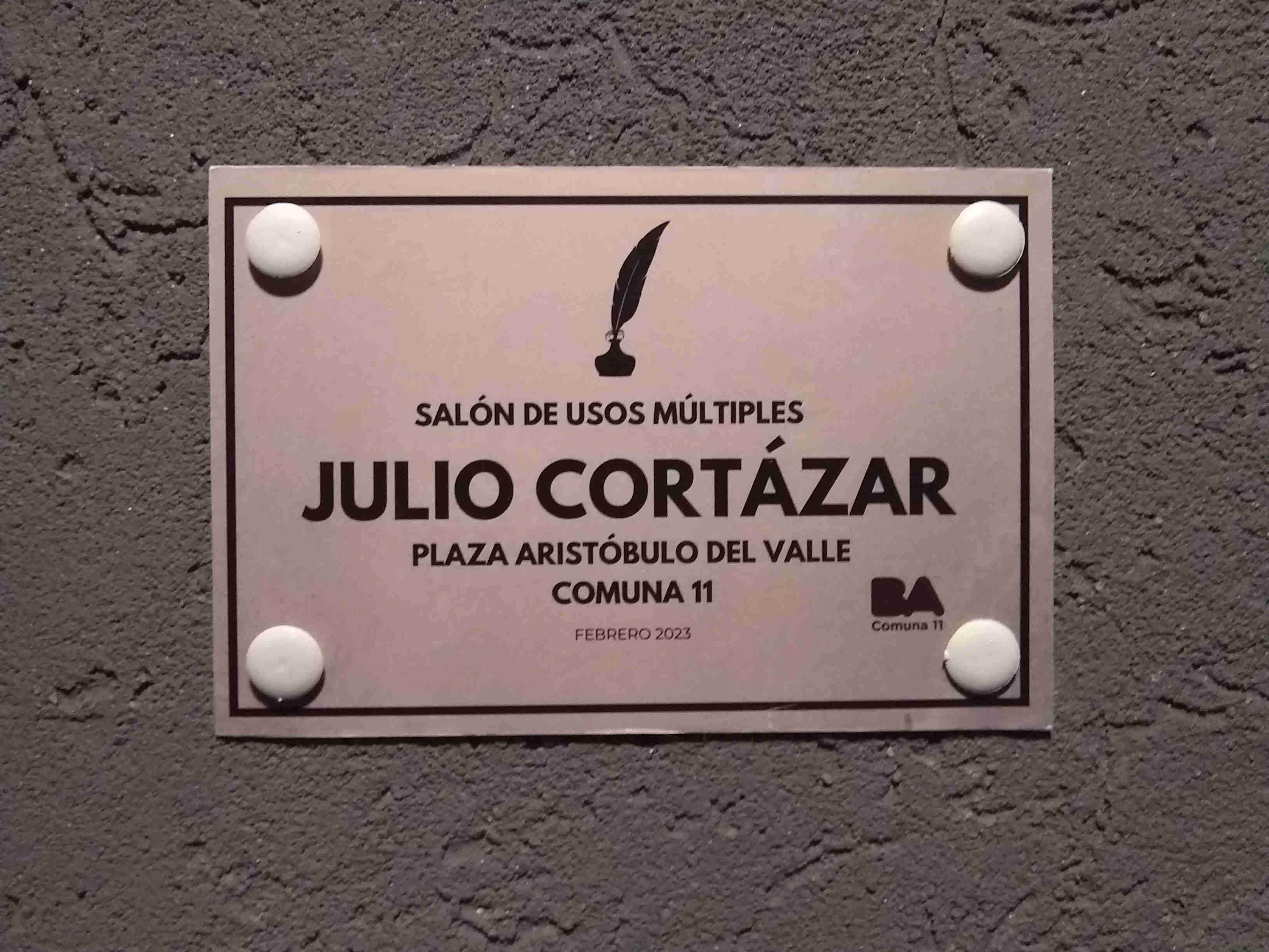 En la tarde de ayer, la escritora Josefina Delgado fue la encargada de traer a Julio Cortázar de vuelta al barrio. La ocasión fue la presentación de la plaqueta con su nombre en el SUM de la plaza Aristóbulo del Valle. Delgado recorrió algunos aspectos de la vida del escritor en una presentación íntima, a partir de sus propios recuerdos de momentos compartidos. El nombre del Salón de Usos Múltiples surgió de una elección virtual en la que participaron más de dos mil vecinas y vecinos