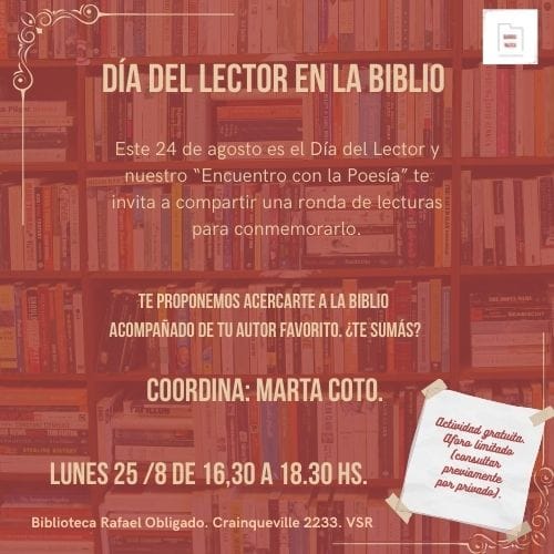 Por su parte, la Biblioteca Rafael Obligado tiene previsto celebrar el Día del Lector el próximo lunes 25 de agosto, de 16:30 a 18:30 horas. La propuesta es armar una Ronda de Lectura organizada por «Encuentro con la Poesía». Podés venir con tu autor favorito o buscarlo en la biblio. Es una propuesta abierta a toda la comunidad.
