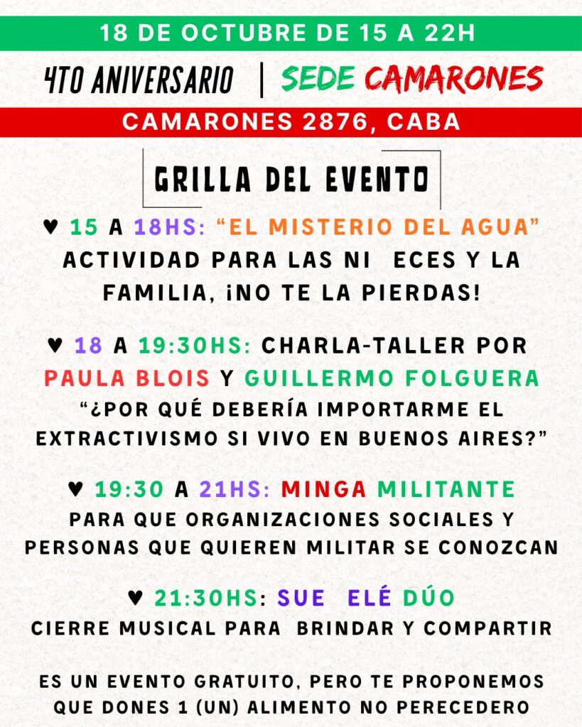 La actividad contará además, con la exposición de los talleres abiertos del Hospital Alvear, un territorio lúdico, con especial énfasis en niñeces. Esta espacio estará abierto de 15 a 18 horas y promete una sorpresa especial con un espacio inmersivo. También habrá un momento para una charla taller con Guillermo Folguera y Paula Blois: “Por qué debería importarme el extractivismo si vivo en Buenos Aires”. Esto será a partir de las 18:00.
