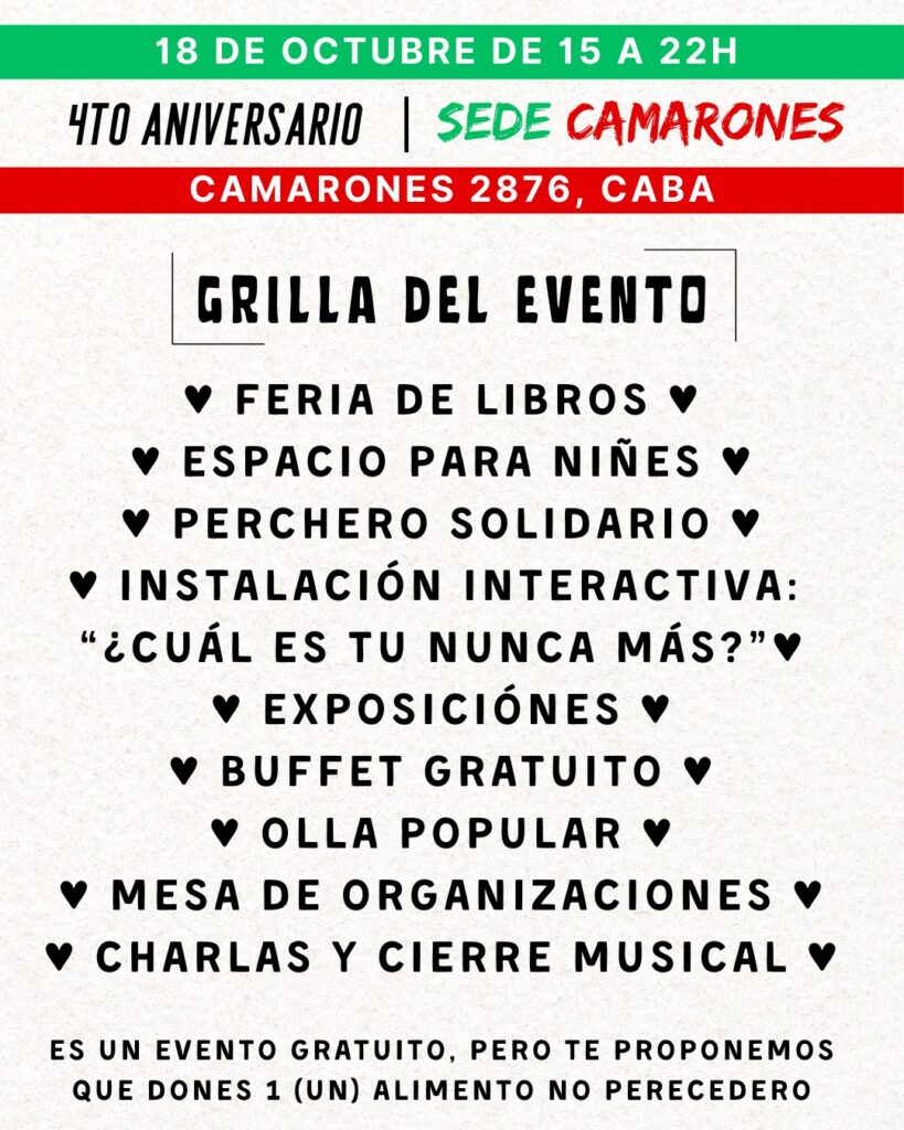 Este próximo sábado, 18 de octubre, la ByLPLI abrirá sus puertas a las 15:00 para recibir a vecinas y vecinos que deseen celebrar estos cuatro años. “Vamos a realizar actividades que ya tienen como una vinculación o se las relaciona bastante directamente con la biblioteca, como por ejemplo una mini feria de libros, un perchero solidario, vamos a tener una mesa de comida y bebida gratis. Vamos a contar con la presencia de dos organizaciones, son el IMPI, Instituto de la Memoria de los Pueblos Indígenas y el Tiempo Fantástico – Jubilades en sintonía.”, explicó Federico en el arranque del detalle de lo que van a encontrar quienes se acerquen a la ByLPLI.