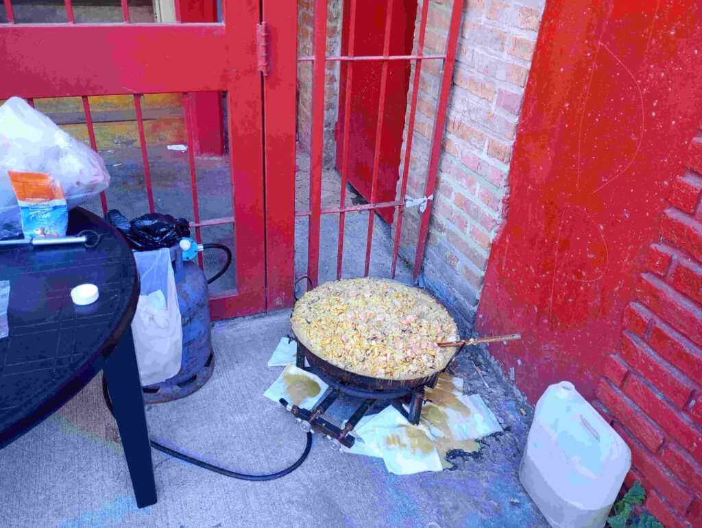 A las 8:15, desde el escenario el profe Santi Cisneros comenzó a dirigir el precalentamiento, mientras a un costado del mismo escenario, lo que estaba entrando en calor era la enorme paella que aportó la pescadería El Esturión.