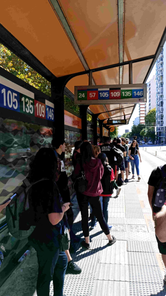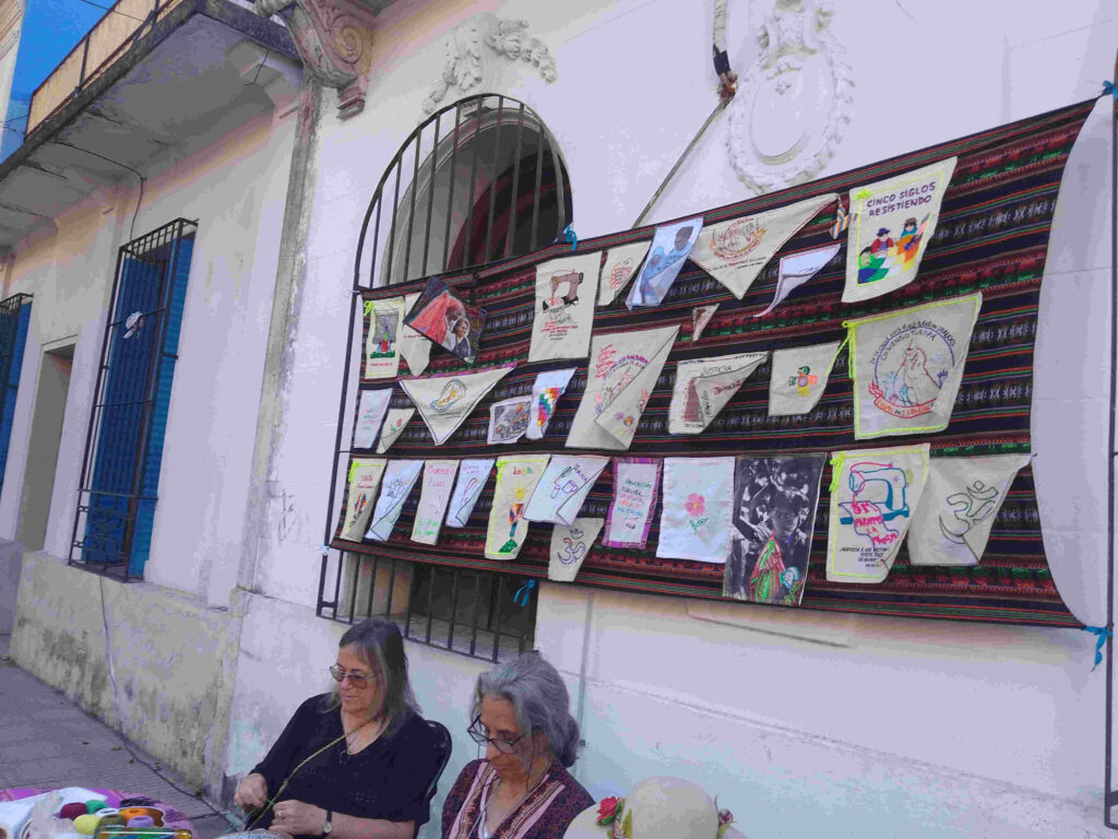 A esa hora también las trabajadoras de “Bordando Historias”, arrancaron a bordar los pañuelos grabados para la ocasión. La mesa llena de pañuelos, agujas e hilos de colores en la vereda de lo que fue la fábrica textil clandestina, generaba muchas ganas de bordar sobre la frase “Confeccionando derechos”. Las mujeres de Bordando Historias se encuentra cada 15 días en Plaza Irlanda y nació como una forma de exigir justicia para las víctimas y hacerlo en la calle como una manera más de visibilizar lo que ocurrió.