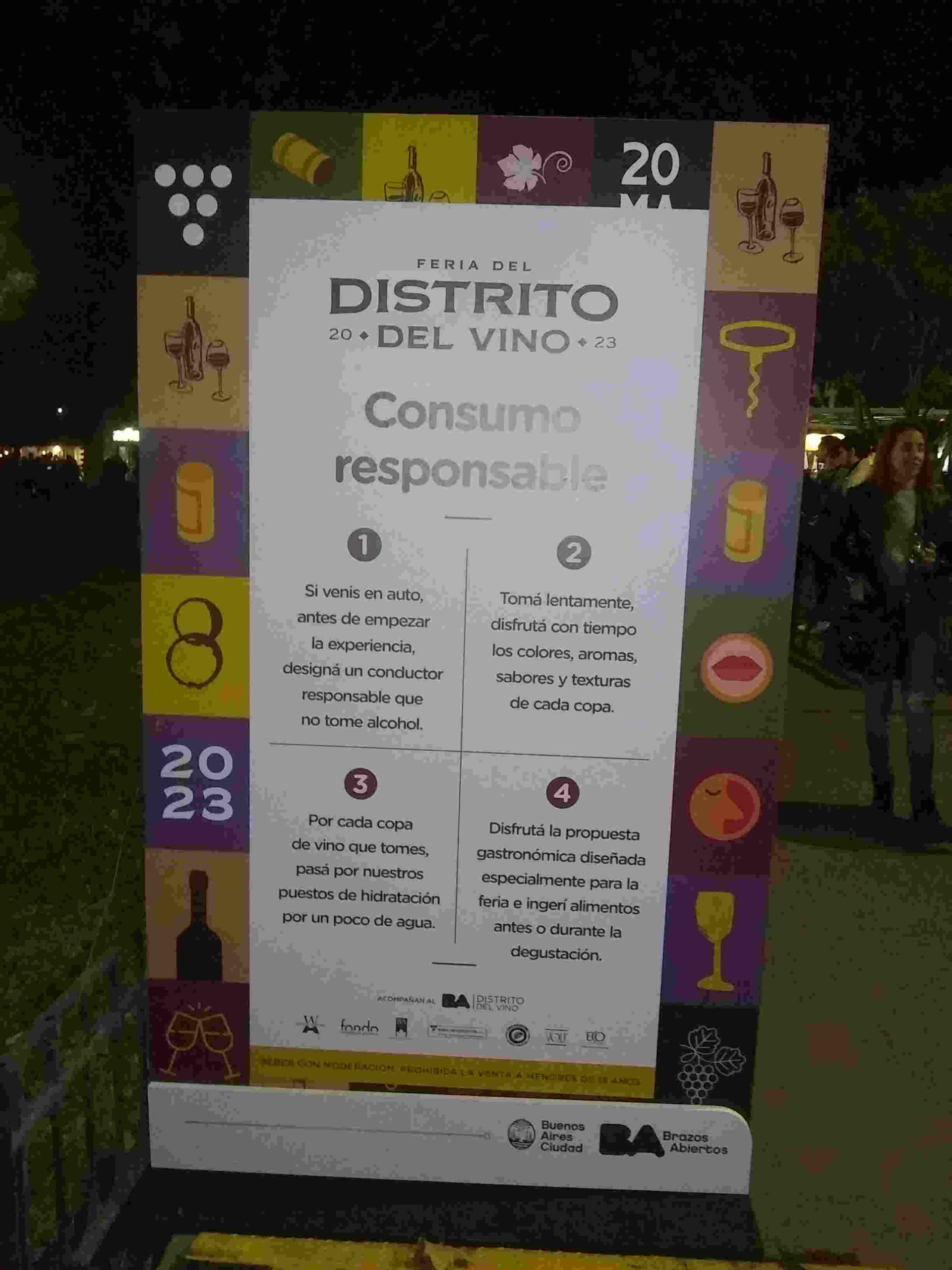 Al entrar a la plaza, un cartel estratégicamente colocado alertaba sobre las prevenciones a tomar. La regla número uno se refería a que “si venís en auto, designá un conductor responsable antes de comenzar a tomar” y luego seguía con otras recomendaciones como tomar lentamente, disfrutando, comer algo antes o durante las libaciones y tomar agua entre copa y copa para hidratarse. Hubo varios puestos donde se entregaban vasos de agua en forma gratuita y algunos stands donde la botella de medio litro costaba $500.