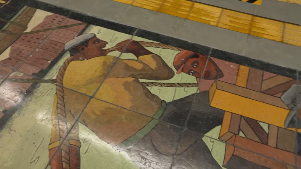 Para apreciar el detalle de “La Descarga de los convoyes”, es necesario bajar la vista porque está desplegado en el piso del anden. Se trata de una obra llamada por su autor, “El Carbonero”, un mural de 6,35 por 4,23 metros basado en un boceto del artista del año 1939 en el que dejó plasmada la llegada de los primeros vagones del subte de Buenos Aires.