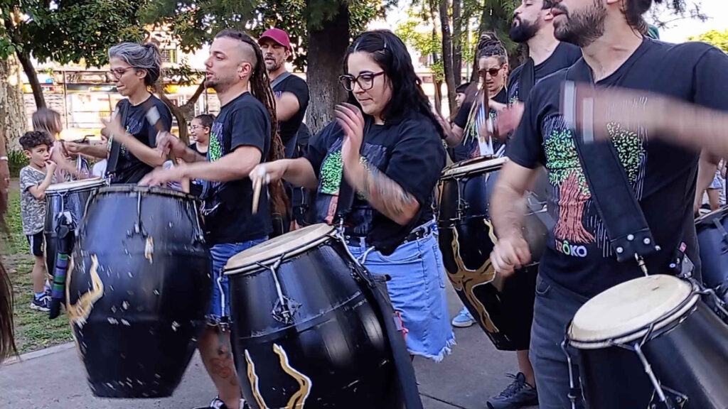 Próximo al cierre de la actividad hizo su aparición el grupo de candombe Iroko con una sólida cuerda de tambores, abriéndose camino con parte de su cuerpo de baile desde uno de los laterales de la plaza de Pappo, hasta ocupar el centro. Como ocurre habitualmente, los tambores que ejecutan alguno de los ritmos de llamada convocan, atraen y atrapan con su ritmo, de manera que rápidamente sumaron bailarinas a su compás.
