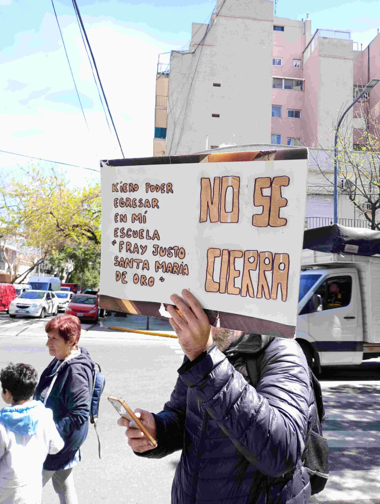El jueves 25 de setiembre, a partir de la hora de salida de los chicos del turno mañana, nuevamente docentes y familias se concentraron en la esquina de la Avda. Álvarez Jonte y Miguel Ángel, cortando alternativamente ambas arterias. No hay resignación y en un punto esperan torcer la decisión de las autoridades del Ministerio de Educación, que hasta ahora no ha mostrado intención de diálogo ni sensibilidad a las demandas de decenas de padres y madres que eligieron y eligen al Fray Justo Santa María de Oro como el lugar donde formar a sus hijos, hijas.
