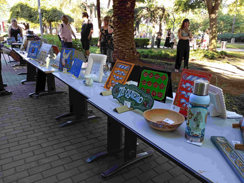 Frente al SUM Julio Cortázar se desplegaron unas mesas con los fileteados del Almacén del Filete de Claudia Medori, una exhibición de trabajos de sus alumnos y alumnas. En uno de los extremos estuvieron haciendo lo suyo en vivo y en directo, dos de los integrantes del grupo de los artistas plásticos. En otro sector de la plaza, la Junta de Estudios Históricos de Villa del Parque exhibió pinturas de talleristas vinculados con la organización.