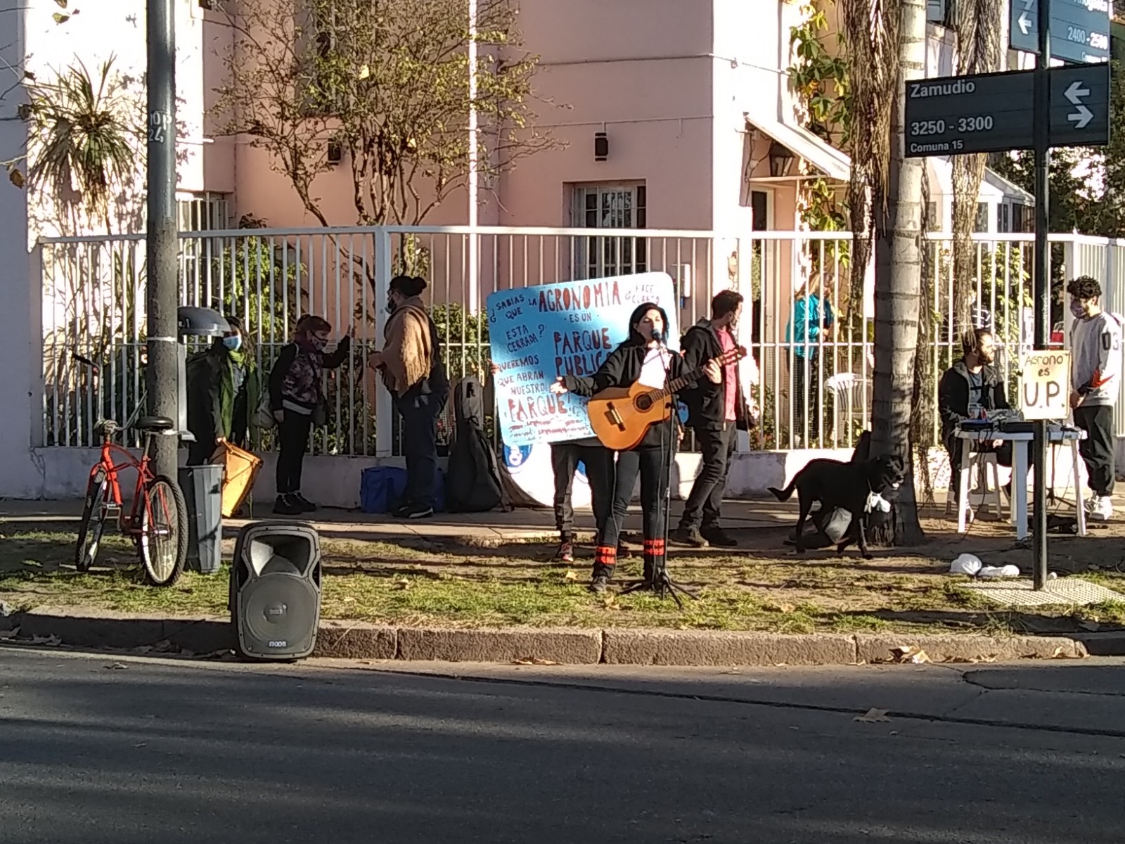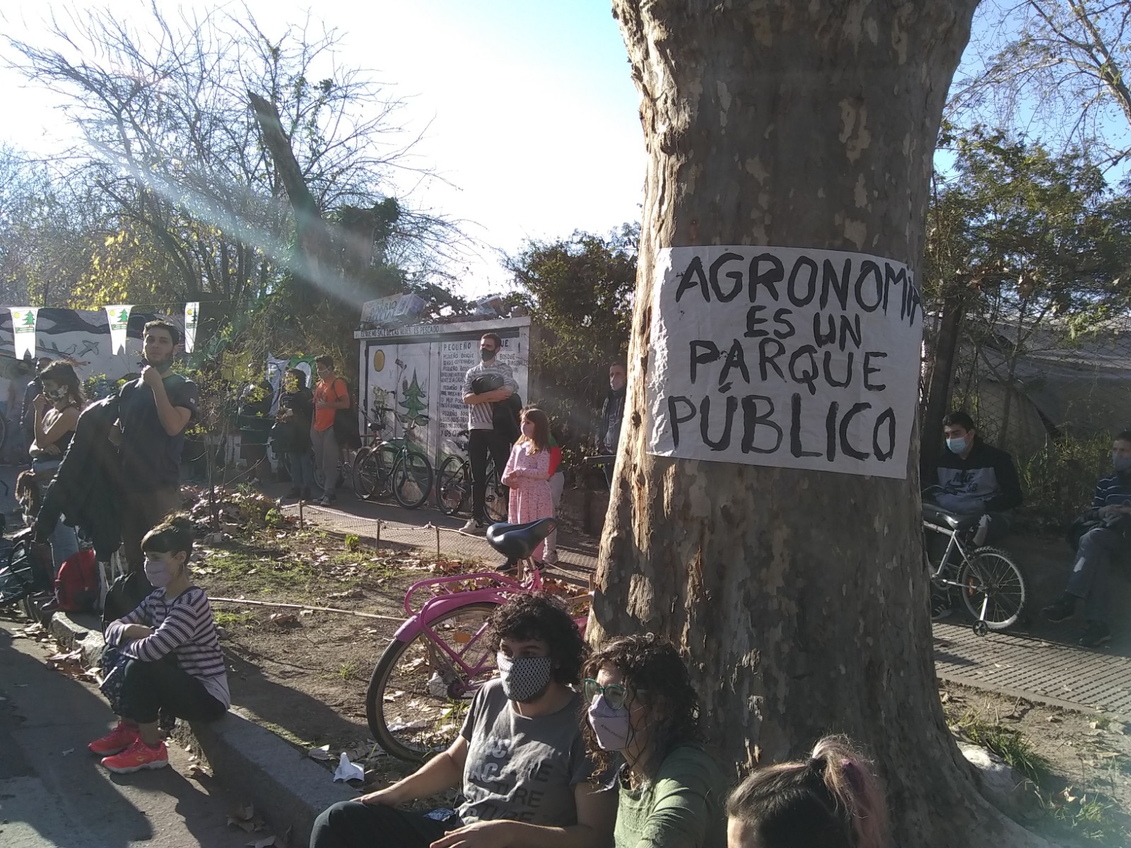 El eje de las demandas de vecinas y vecinos es la reapertura del parque, cerrado desde la promulgación del DNU 297/2020. En la CABA, todos los parques y plazas de la ciudad han vuelto a permitir actividades con relativa habitualidad, al punto que en algunos meses de verano se pudieron festejar cumpleaños de niños y niñas respetando los protocolos de distanciamiento al aire libre. Salvo este parque, pulmón de media docena de barrios y visitado por vecinos de toda la ciudad. Las organizaciones barriales organizadoras del abrazo, en un tríptico repartido el domingo, consideran que el decreto del Poder Ejecutivo Nacional le dio a la UBA y a esta facultad, la excusa y oportunidad para avanzar con la restricción del acceso al público. Pesa en esta opinión el muro construido en 2019 sobre Tinogasta para cerrar la entrada de la calle Zamudio, complicando y desmotivando el ingreso. Sobre todo porque ese muro de construcción inconsulta se levanta luego de haberse apoyado la UBA en la lucha de vecinas y vecinos organizados, para frenar en 2017 las intenciones del gobierno local de abrir al tránsito la calle Zamudio atravesando la facultad. Los vecinos pusieron el cuerpo y el trazado de la calle Zamudio fue suprimido del nuevo Código Urbanístico de la Ciudad, así como la construcción de un mega estadio en los terrenos del Club Comunicaciones. Dos años después de aquellas acciones en las que se involucró la Facultad de Agronomía, es la misma facultad la que se separó de los vecinos con este muro.