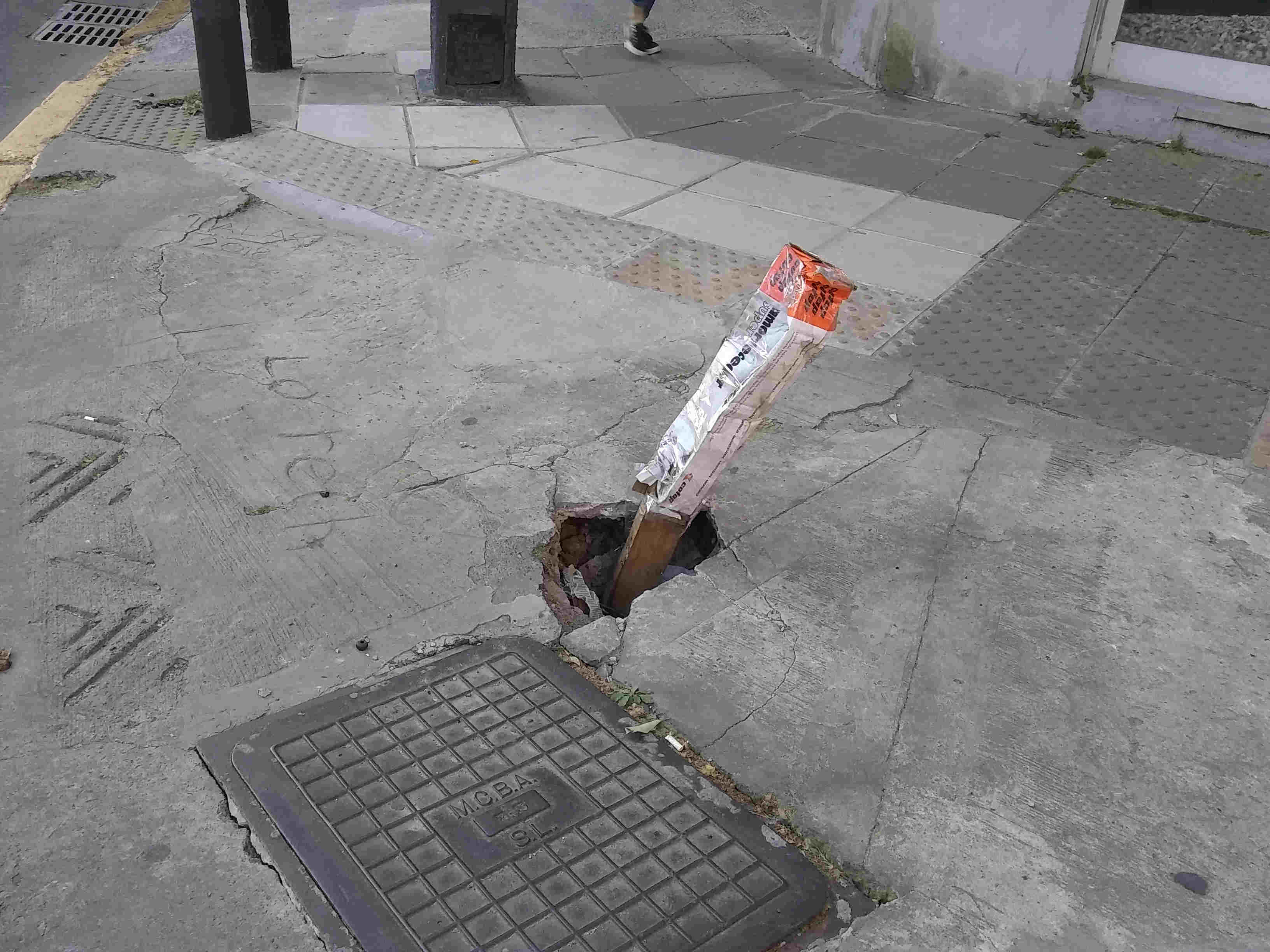 La de Carranza es una esquina que está a tono con el deterioro de las veredas de la Avenida Nazca. En setiembre de 2021 recogimos con esta foto la queja de vecinas y vecinos que veían con alarma lo que estaba ocurriendo con esa bajada y ante la aparición de un pozo de importantes dimensiones decidieron señalizarlo con una madera y un colorido cartón.