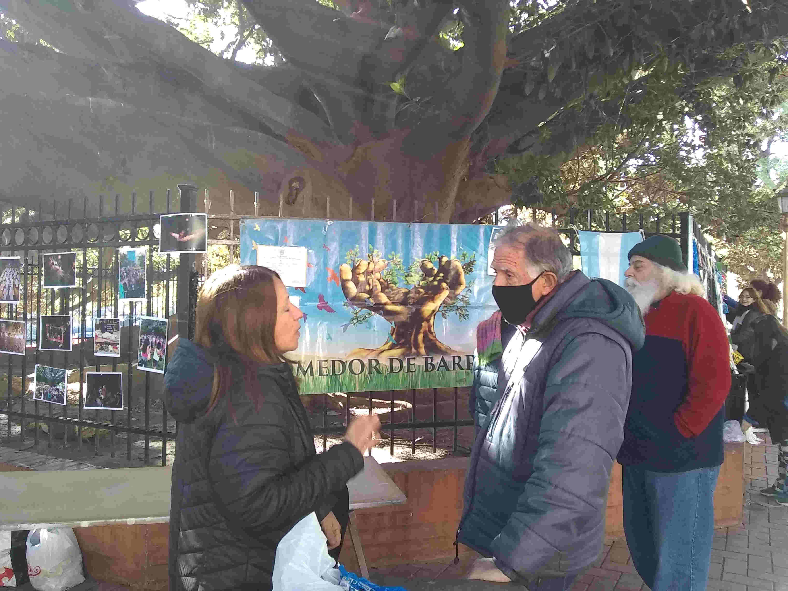 Ahora, mientras avanza la mañana, en pocos minutos con unos caballetes y una tabla, quienes aún sostienen el comedor arman una mesa sobre la que ponen un gran termo con mate cocido, los alfajores, los vasos y, lo más importante, decoran el lugar para celebrar un auténtico cumpleaños. Carlos Durañona es el único de aquellos vecinos que iniciaron esta acción que aún está ahí. Nos invita a pasar a su oficina, una de las raíces expuestas más gruesas. Nos sentamos y comienza a compartir recuerdos, momentos que lo cambiaron para siempre, así como con el accionar colectivo, cambió para siempre algunas vidas, tanto de personas en situación de calle, como de algunos de los frentistas.