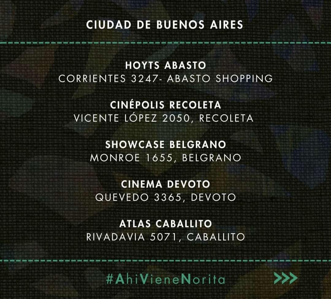 A partir de hoy podrás reencontrarte con Norita en las siguientes salas de CABA: Atlas Caballito, Hoyts Abasto, Cinépolis Recoleta, Showcase Belgrano y la sala dentro de la Comuna 11 es Cinema Devoto en la calle Quevedo 3365.
