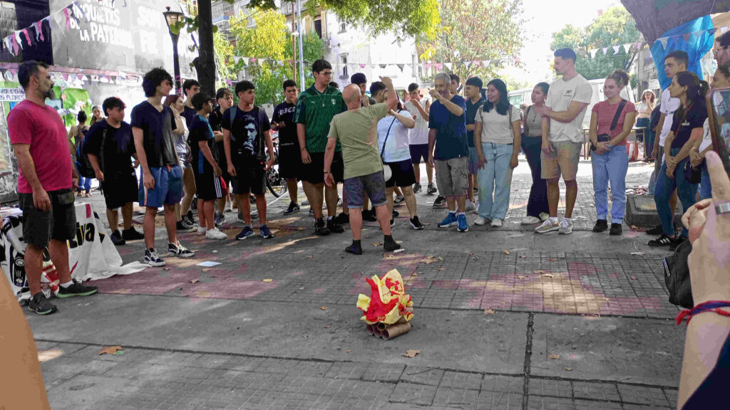 El final tuvo su momento lúdico a cargo de los profesores de Recreación Comunitaria que armaron una gran ronda con la propuesta de despedirse con un malambo, pero sin instrumentos, sonoro, absolutamente coral, mientras en el centro de la ronda un fuego simbólico en papel ardía.
