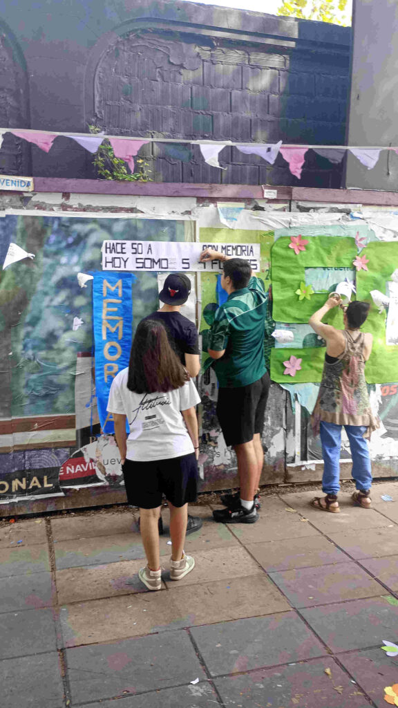 Alumnos y Alumnas de la EEM-2 Argentinos Juniors ocuparon la mañana en armar una suerte de mural efímero contra uno de los carteles de publicidad. “Hace 50 años plantaron memoria, hoy somos sus flores”, encabezaba el cartel y de esta manera eligieron la resistencia, particularmente de madres y abuelas, para celebrar la memoria.