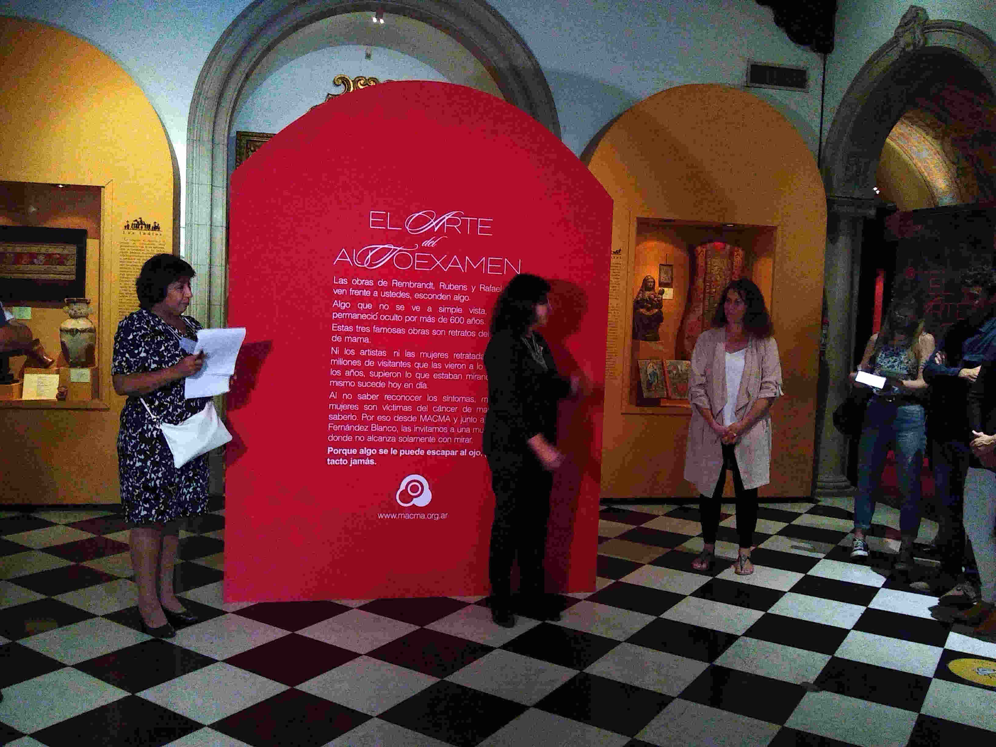 El Movimiento Ayuda Cáncer de Mama inauguró ayer en el museo Fernández Blanco, sede Palacio Noel, la primera muestra de arte interactiva. El público presente fue invitado a cambiar el rol de espectador para palpar y descubrir protuberancias en glándulas mamarias de modelos retratadas hace cientos de años por Rafael, Rembrandt y Rubens. La muestra estará abierta hasta el 27 de marzo