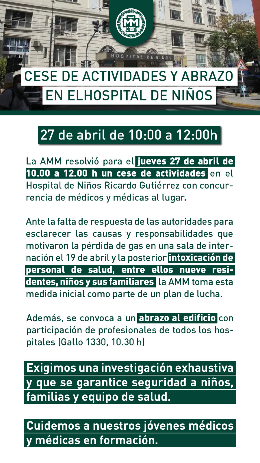 La Asociación de Médicos Municipales convocó para el día de hoy a un cese de actividades entre las 10 y las 12 horas en el hospital de niños. La medida de fuerza se debe a la falta de respuestas de las autoridades respecto a la fuga de gas ocurrida el 19 de abril, que afectó a profesionales de la salud, pacientes y sus familiares