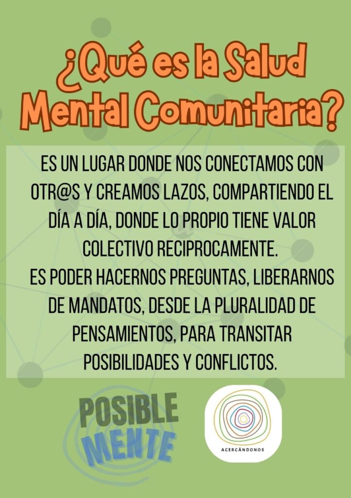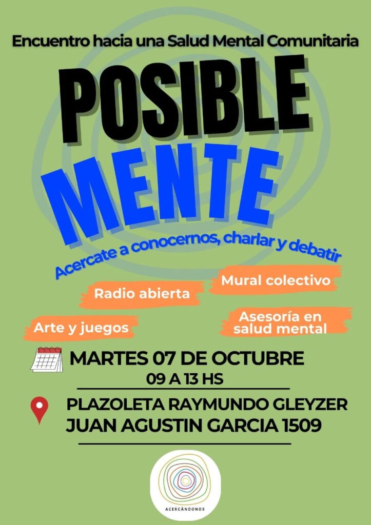 El próximo martes 7 de octubre, el colectivo Acercándonos realizará en la plazoleta Raymundo Gleyzer, Juan Agustin García 1509, a metros de avenida San Martin en el barrio de La Paternal, “Posible Mente”. Se trata de una actividad destinada a abordar la salud mental comunitaria. La invitación es a partir de las 9:00 y culminará a las 13 horas. Durante ese lapso, integrantes del Centro de Salud y Acción Comunitaria 34 (CESAC 34), así como de varias organizaciones de las Comunas 11 y 15 coordinarán con vecinas y vecinos una serie de actividades destinadas a definir colectivamente la salud mental comunitaria y proponer espacios de encuentro.