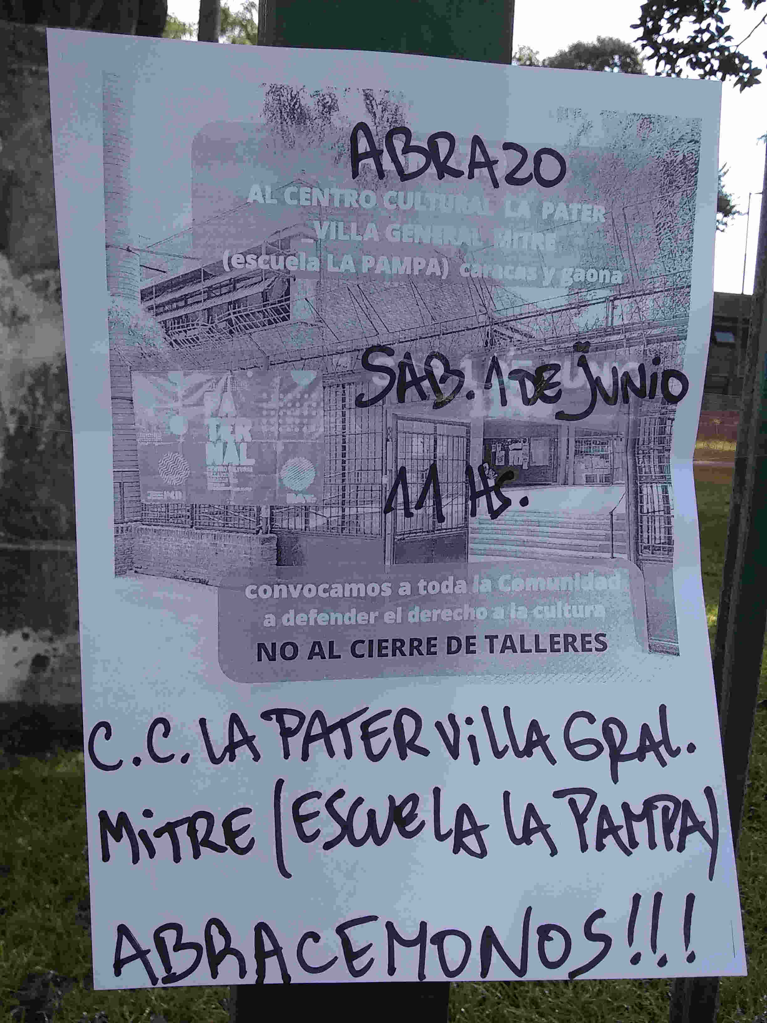 Decenas de vecinas y vecinos de Villa Mitre y Paternal se dieron cita el sábado pasado, 1 de junio, a las 11 de la mañana, en la escuela Provincia de la Pampa, Caracas 1249, casi Gaona, para denunciar fuertes recortes en el presupuesto del Centro Cultural La Paternal que allí funciona fuera del horario escolar.