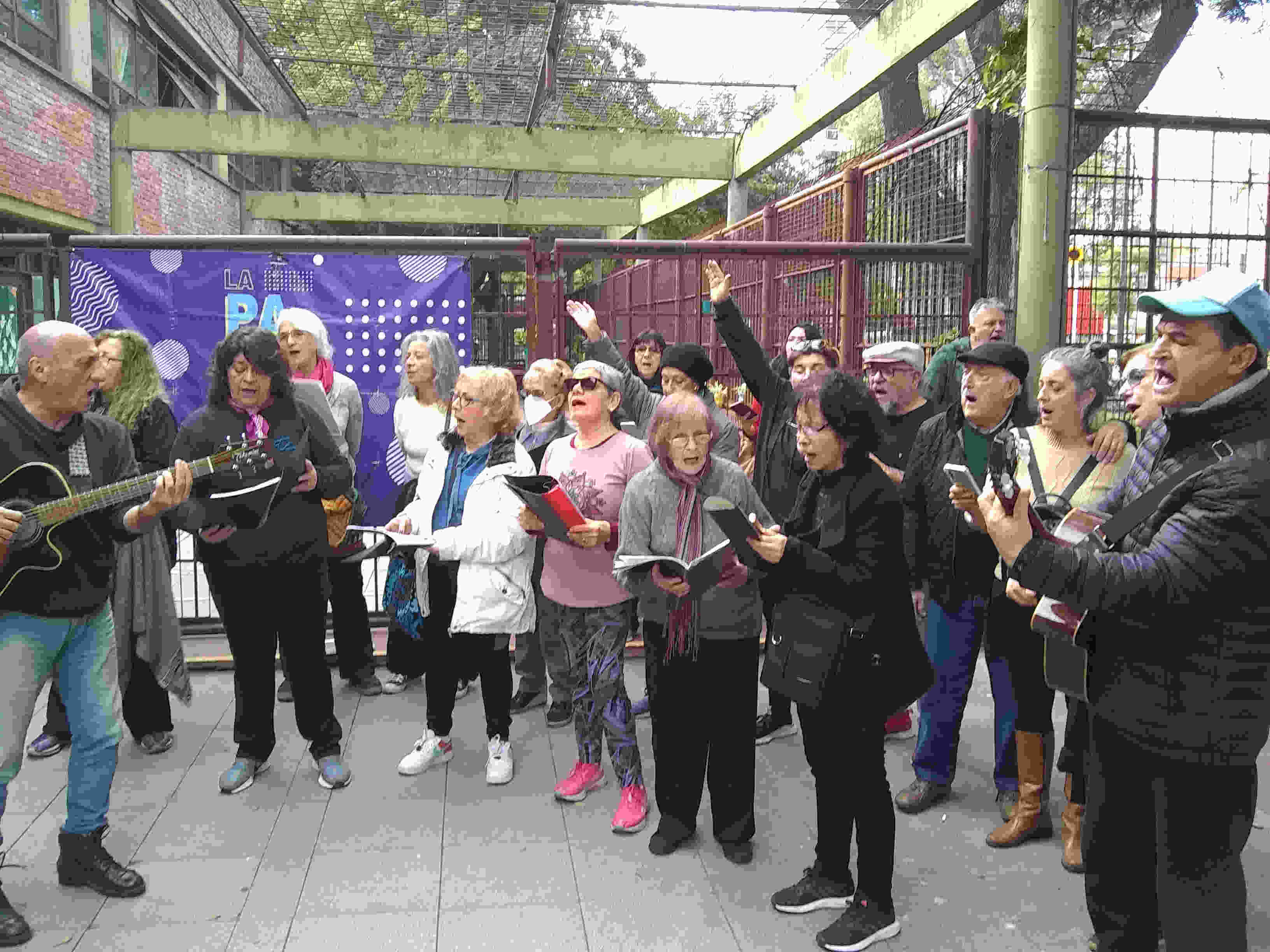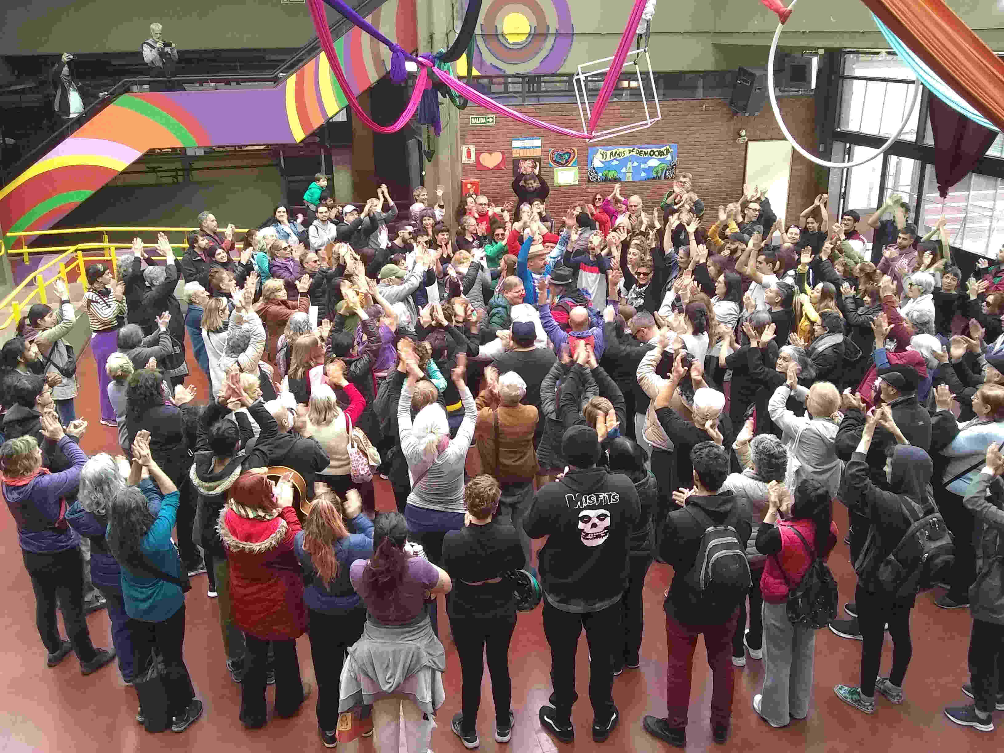 Para cerrar la participación de los talleres se juntaron los dos de coro y eligieron “Como la Cigarra”, acompañados por decenas de gargantas con la viva emoción de entonar esta canción tan emblemática para Nora Cortiñas. Minutos antes había sido el momento del emocionante abrazo caracol, gigante, que bajó hasta el corazón del centro cultural y de la gente reunida. En ese marco conversamos con Egle Almada, a la que le costó articular palabra: