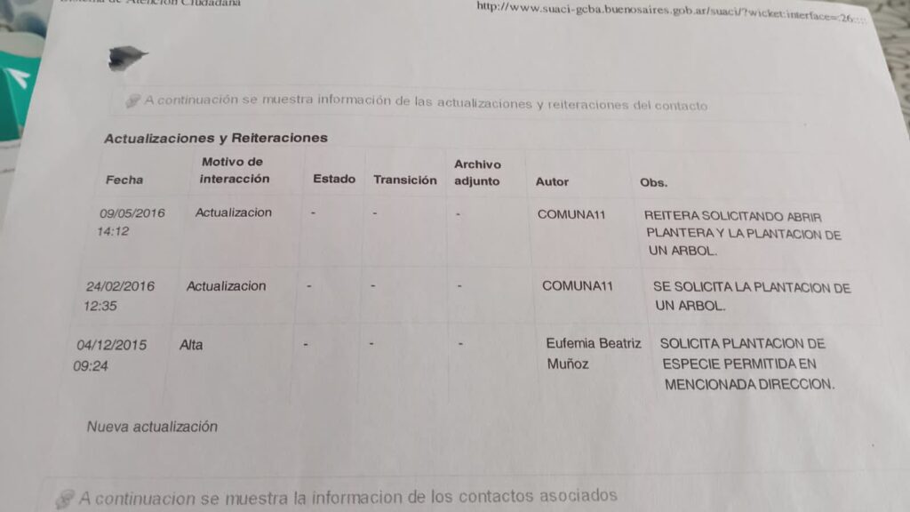 Así pasaron los años, entre otras cosas Eufemia fue conectándose con instituciones diversas que se ocupan del arbolado, todas por fuera del tejido oficial del Estado porteño. De esta manera juntó consejos y llegó a la conclusión de que es básico y elemental juntar firmas. El 7 de octubre de 2023 regresó de su luna de miel y ese mismo día llamó al director de Árboles sin fronteras. “Lo primero es juntar firmas – me dijo – Primero en su edificio”. Y así empecé a juntar firmas, pero me dije: “ahora no voy a ir por un árbol, voy a ir por muchos árboles”, pensando también en los nietos.” Y la solicitud de febrero de 2024 fue para armar planteras y plantar árboles por Marcos Sastre, desde Nazca hasta Campana.