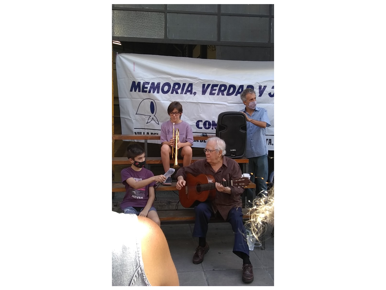 El acto en sí arrancó con uno de los momentos más emotivos de la mañana, Jerónimo, que cumplía 12 años ese día, ejecutó en trompeta estrofas del himno nacional y luego formó dúo con el Tata Cedrón, 81 años, prócer de nuestra música. Trompeta, guitarra y voz dieron vida al tema de Atahualpa Yupanqui “Vidala para mi sombra” y la cuadra quedó en silencio.