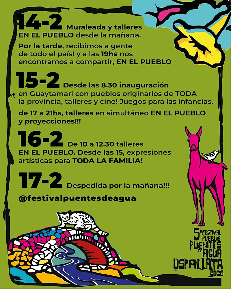 A pesar de que Legislatura provincial habilitó en diciembre de 2025 la megaminería metalífera en la provincia, en Mendoza las protestas populares continúan con asambleas, movilizaciones y actividades todas las semanas. En ese marco de resistencia y cuando el Gobierno nacional impulsa el tratamiento de la modificación de la Ley de Glaciares (norma clave para la protección de las reservas de agua dulce y de los ecosistemas de alta montaña), el 5° Encuentro-Festival Pueblos Puentes de Agua tendrá lugar los días 14, 15, 16 y 17 de febrero en la localidad mendocina de Uspallata, donde se pretende instalar el Proyecto San Jorge, de megaminería de cobre y oro. Allí se encontrarán activistas, vecinos/as, asambleas socioambientales y organizaciones que defienden el agua y los territorios, con el objetivo de «intercambiar experiencias de resistencia contra los extractivismos, visibilizar las diferentes problemáticas y pensar estrategias comunes de lucha». Habrá talleres, proyecciones, una caminata y un festival musical. Conocé el cronograma completo. Cobertura colaborativa de ANRed, Huella del Sur, Asamblea Uspallata, Que Arda Radio, Archivo por el Agua, FM Alas, La Mosquitera y Karne de Maquina.