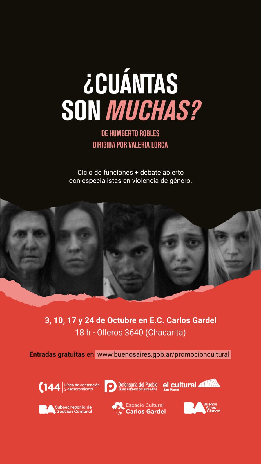 Todos los domingos de octubre, en el Espacio Cultural Carlos Gardel sube a escena la obra de teatro ¿Cuántas son muchas? La presentación forma parte de una campaña de concientización y sensibilización sobre los femicidios. La entrada es gratuita, previa reserva en la página del Gobierno de la Ciudad. Al finalizar la función se realiza una charla con la presencia de profesionales […]